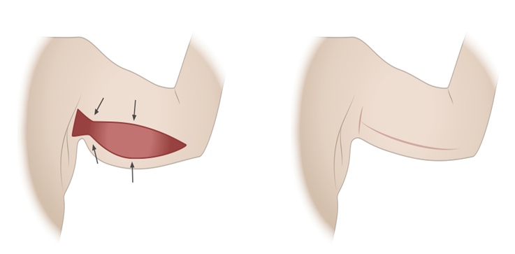Dann wird die Haut des medialen Aspekts des Armes entfernt und dann in Schichten vernäht. Mit dieser Technik ist die Narbe nicht sichtbar von der hinteren, lateralen oder anterioren Ansicht.